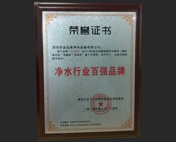 以質(zhì)量打造品牌,以誠信贏得市場!深圳市金品泉凈水設(shè)備有限公司旗下品牌“金品泉”在2014年度由凈媒網(wǎng)攜凈水器第一媒體舉辦的“凈媒杯”活動中,被千網(wǎng)網(wǎng)民、百萬用戶、全國代理商投票評選為“凈水行業(yè)百強(qiáng)品牌”!這是廣大用戶對深圳市金品泉凈水設(shè)備有限公司專研凈水行業(yè)多年來長期不懈的堅持“品質(zhì)第一,誠信第一,服務(wù)至上”為企業(yè)生存法則信條的中肯和認(rèn)可!金品泉作為凈水器行業(yè)的領(lǐng)跑者將再接再厲,以更加優(yōu)質(zhì)的產(chǎn)品和服務(wù),為代理商持續(xù)不斷的提供最優(yōu)質(zhì)的服務(wù)保障,讓老百姓喝上健康、優(yōu)質(zhì)、放心的水,為大眾帶來健康!