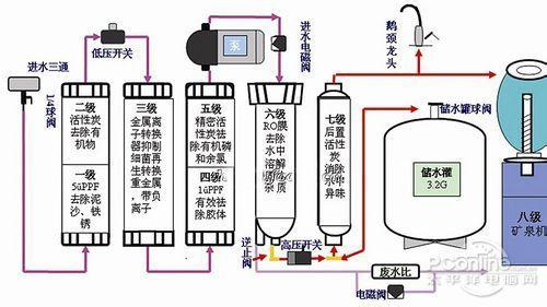 一般的家用凈水器原理結(jié)構(gòu)是含有3-5層核心凈水器濾芯。笫一級為濾芯又稱PP棉,主要用來過濾泥沙,懸浮物等肉眼看得見的污染物,第二級顆?;钚蕴迹梢砸揽课阶饔贸ニ械漠愇?、異色以及一般的大分子物質(zhì),而第三級為精密壓縮活性炭,能夠除氯和有機(jī)雜質(zhì),笫四級為反滲透膜或超濾膜,能夠去除水中的細(xì)菌、病毒及孢子等物質(zhì),最后一級為后置活性炭,主要用于改善口感。